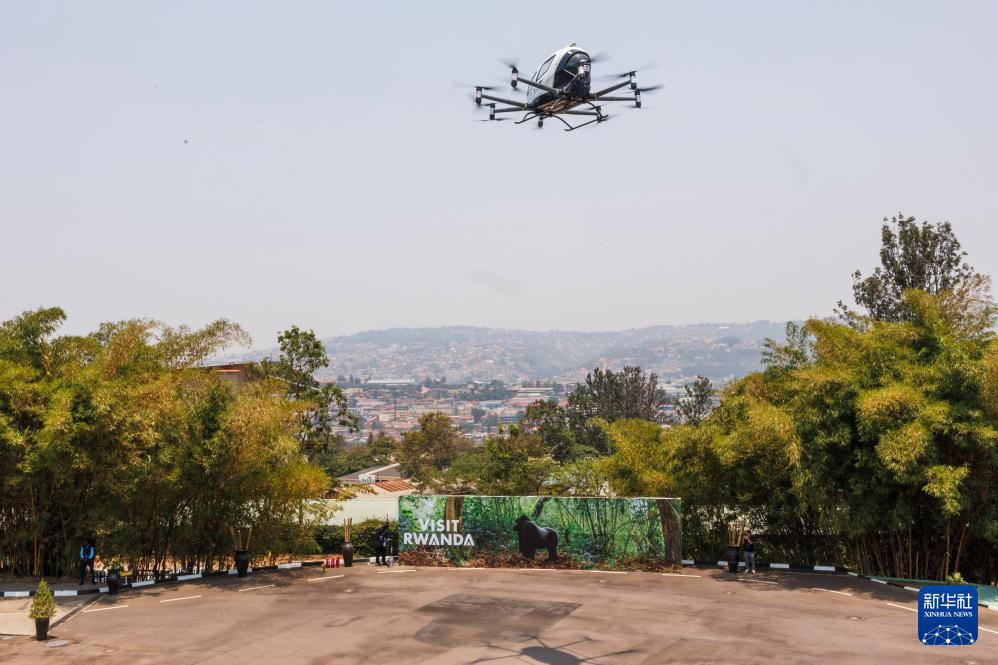 9月4日,在卢旺达首都基加利举行的第九届非洲航空峰会上,中国亿航智能旗舰产品EH216-S电动垂直起降飞行器(eVTOL)进行公开飞行展示。新华社发(西里尔·恩德格亚摄)