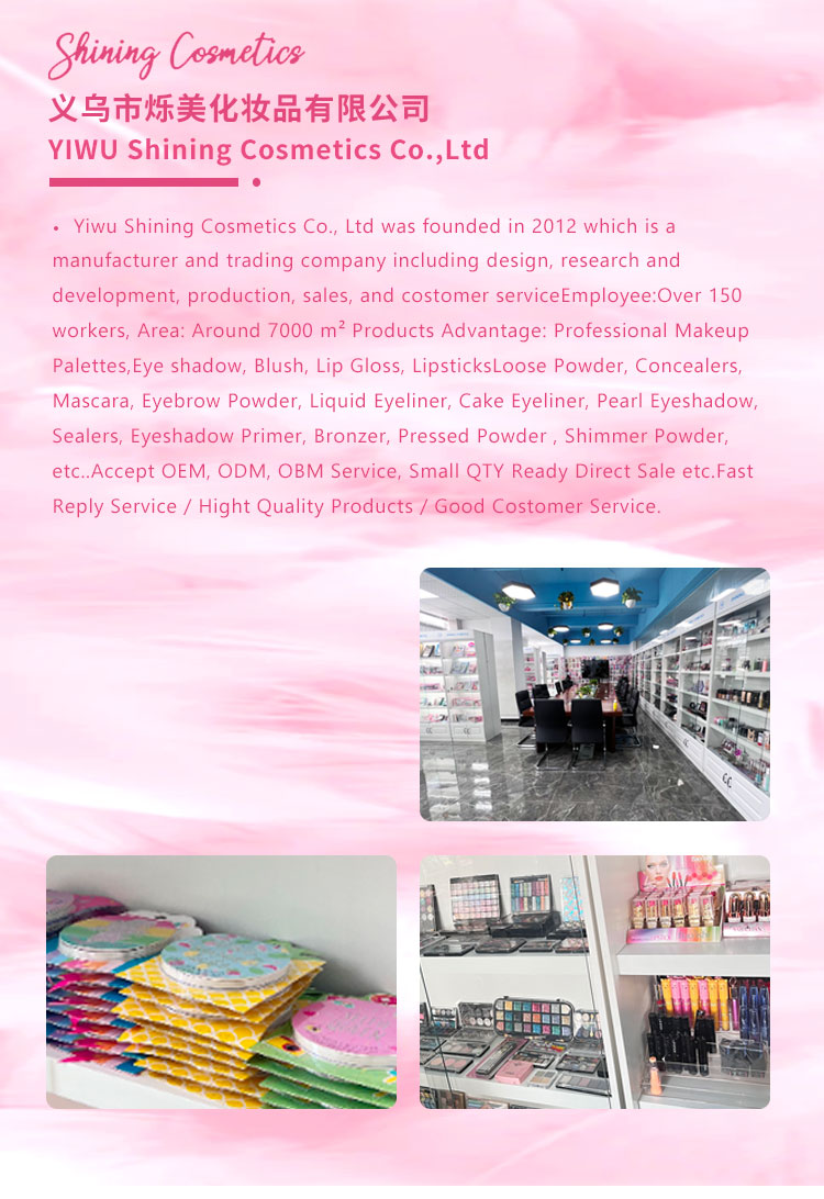 义乌市闪亮化妆品有限公司成立于 2012 年,座落于义乌市上溪镇高速公路入口附近,交通便利。公司占地面积 10000 平方米,目前拥有 300 多名技术人才和员工,具备强大的生产能力。公司拥有十万级空气净化车间,已通过 ISO9001、ISO22716、GMPC 认证体系、BSCI、SEDEX 等认证。公司主要生产彩妆及洗护产品,彩妆拥有全品类的生产线,包含但不仅限于眼影、腮红、粉饼、唇彩、口红、指甲油、睫毛膏、眼线笔、化妆品套装和身体护理产品。产品销往美国、欧洲、俄罗斯、澳大利亚等国家。