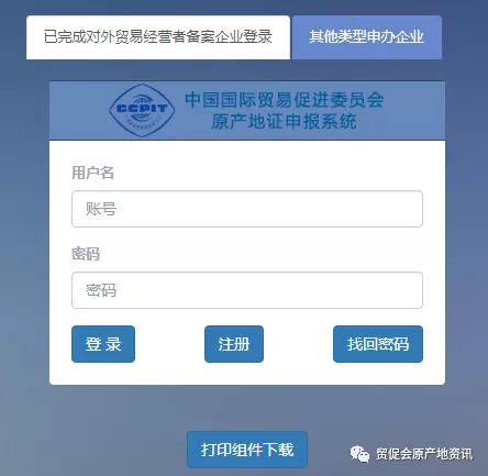 1.企业完成对外贸易经营者备案后,可登录贸促会原产地证申报系统http://qiye.ccpiteco.net。