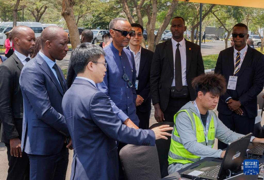9月4日,在卢旺达首都基加利举行的第九届非洲航空峰会上,卢旺达总统卡加梅(左四)在中国亿航智能公司展区观看飞行器操作演示。新华社发(西里尔·恩德格亚摄)