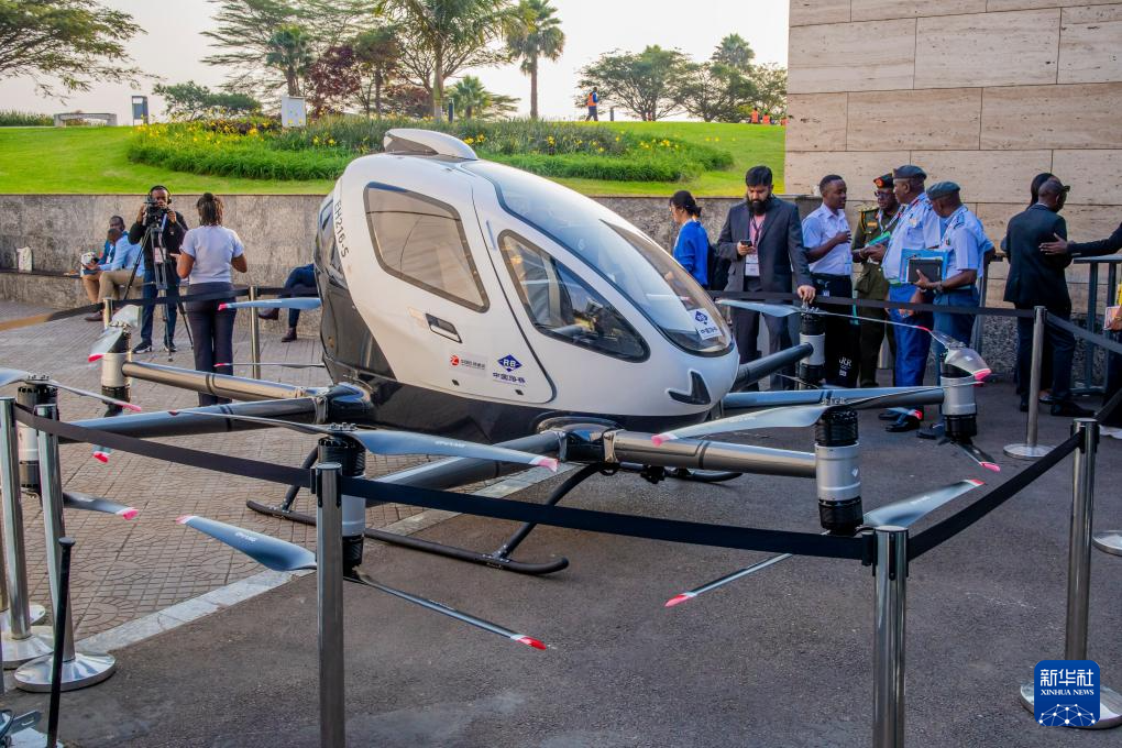 9月4日,在卢旺达首都基加利举行的第九届非洲航空峰会上,中国亿航智能旗舰产品EH216-S电动垂直起降飞行器(eVTOL)进行公开飞行展示。新华社发(西里尔·恩德格亚摄)